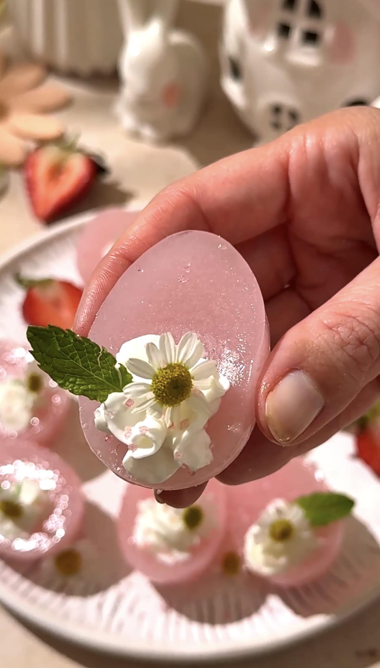 - When ready to serve, carefully remove the jello shots from the molds. You may need to run a paring knife around the edges if they are sticking. Place on a serving plate. Top each egg with a dollop of whipped cream or whipped topping (whipped topping will hold for longer). If desired, top with sprinkles, edible flowers and mint sprigs.
