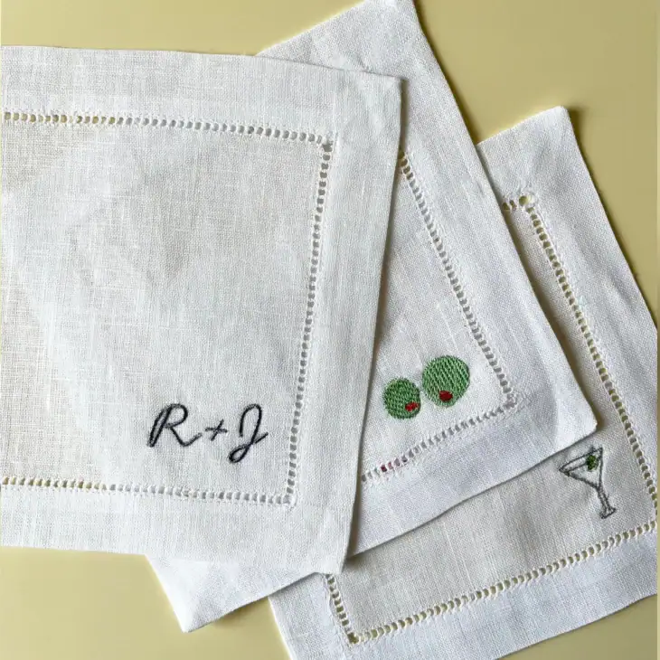 These custom embroidered linen napkins are such a thoughtful gift for the ‘tini lover in your life. You can customize the thread color and order a set of 4 or 6.