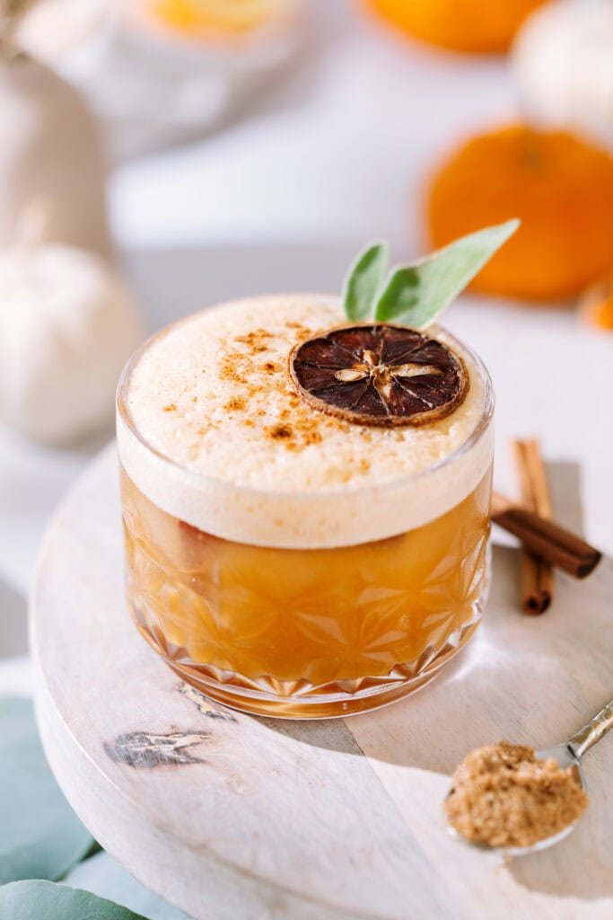 Step 2: Pour the mixture into a cocktail glass over a large ice rock (you can check out my favorite glasses here). For the finishing touches, top it off with a sprinkle of pumpkin spice and garnish with a dehydrated lemon wheel and a sprig of sage, if desired.